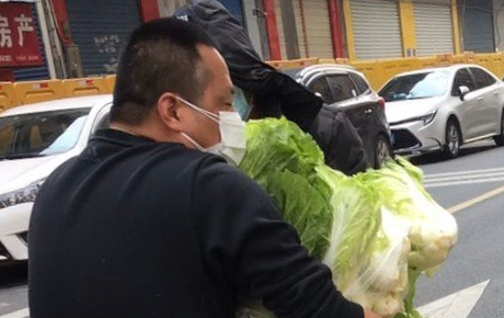 袁虎威一个人抱起百斤蔬菜揣在怀里,生怕手里的菜掉下来,赶来帮忙的同事给他拍下了这一瞬间。